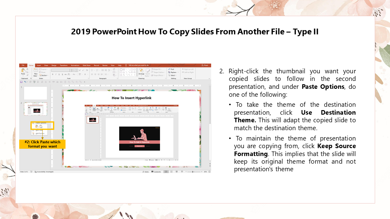 Step 2: Right-click the thumbnail you want your copied slides to follow in the second presentation, and under Paste Options, do one of the following: