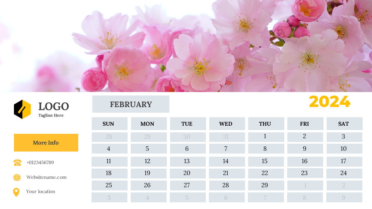 This template joins pre-designed 19-pack slide deck presentations with a modern layout and catchy logos. This slide visually frames the 2024 calendar from Jan to Dec month. This first slide features a vibrant photograph of orange flowers with a butterfly on one of the blooms. In the bottom left corner, there are placeholders for contact information (phone number, website address, and location) next to corresponding icons. At the top left corner, there’s an area labeled “LOGO” and “Tagline Here,” indicating where a company logo and tagline can be placed.