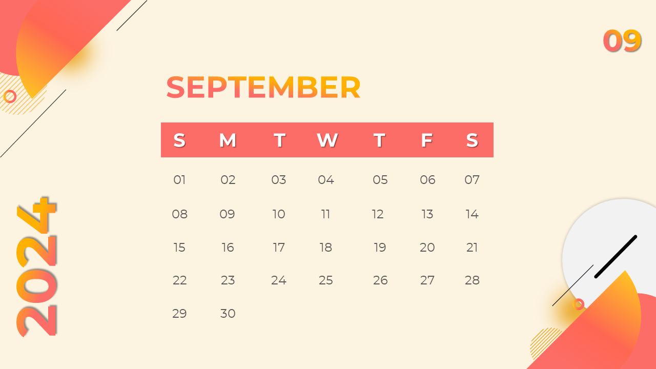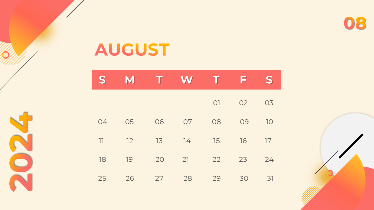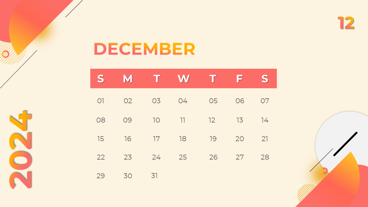 The 2024 Calendar PPT Template refers to a chronological arrangement of days, weeks, and months for the year 2024. It serves as a practical tool for organizing and planning various activities, events, and appointments throughout the year. This 2024 Calendar is a meticulously designed tool that seamlessly combines functionality and aesthetics, providing an intuitive and visually appealing way to manage time, events, and deadlines throughout the year. Crafted with user-friendly features, it ensures a smooth planning experience for personal and professional use. With clear, concise layouts and intuitive navigation, staying organized has never been more efficient. This template suits anyone seeking an effective and visually pleasing way to structure their 2024 schedule. It offers a structured platform for managing events, appointments, and deadlines, ultimately enhancing productivity and time management skills. Compatible with both PowerPoint and Google Slides, it ensures accessibility across various platforms, and its customizable features enable users to tailor the calendar to their specific needs. From modifying elements to suit individual preferences to streamlining the planning and scheduling process, this template benefits presenters by enhancing organizational proficiency. We encourage you to utilize this versatile calendar template and make the most out of the year 2024.