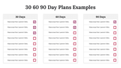 Bring 30 60 90 day plans presentations to life with our 30 60 90 Day Plans Examples PowerPoint Slide. This deck includes 36 brilliantly designed slides to present your 30 days, 60 days, and 90 days plans. Using this slide, you can present the priorities, goals, key success metrics, passed, ongoing, and upcoming plans, learning, initiative, and performance goals, task information, comments, and actions, learning, execution, and personal goals, etc. These slides have neat and well-organized layouts with perfect graphical elements, which will enable you to make professional-looking presentations in a few minutes. Try now!