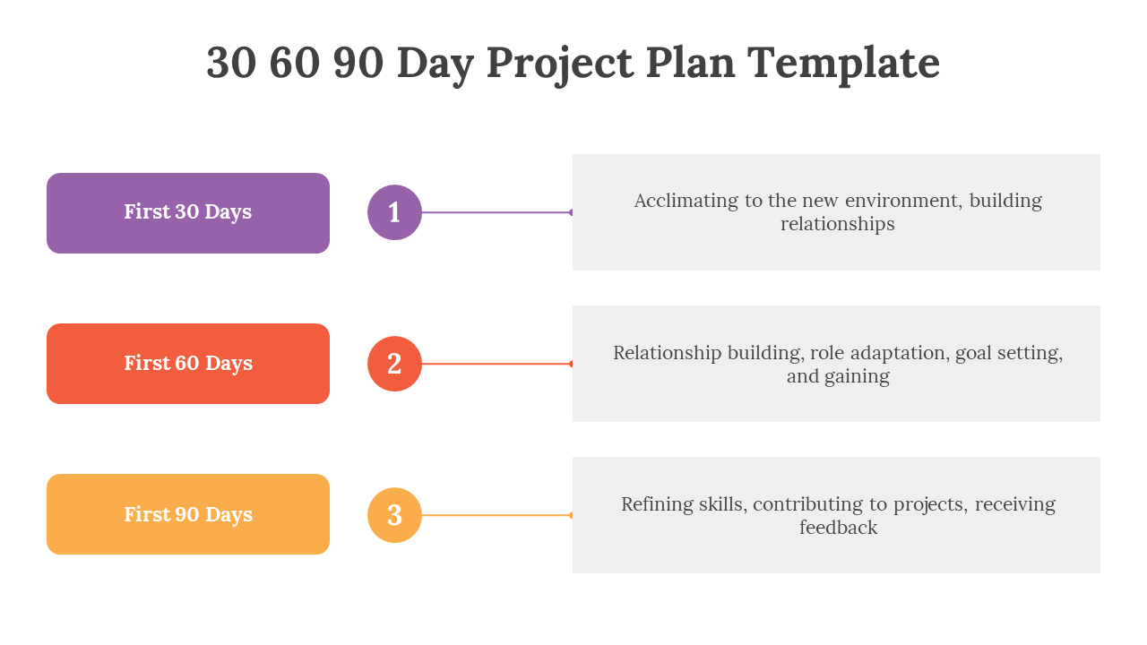 The 30 60 90 day project plan is a strategic framework that outlines specific goals, milestones, and actions to be taken within designated time frames. In the initial 30 days, the focus is on understanding the project, setting objectives, and planning tasks. The subsequent 60 days involve executing tasks, monitoring progress, and making adjustments as needed. In the final 90 days, efforts are directed towards completing the project, evaluating outcomes, and preparing for project closure. Use this template to effectively organize and manage your project's timeline and deliverables.