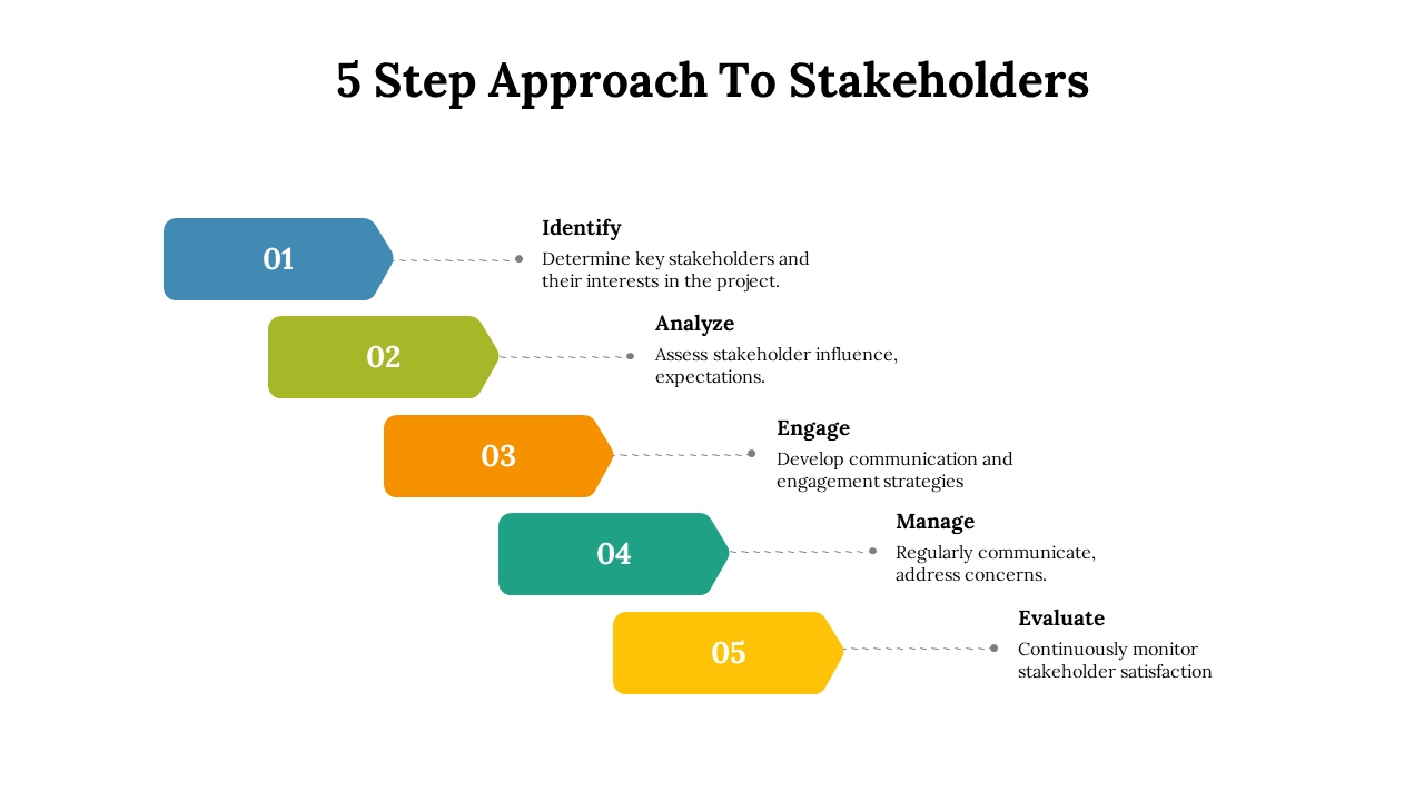 The 5 step approach to stakeholders PowerPoint ppt template can be the outcome for your compelling presentation. The template given is added with five nodes which are circularly designed.