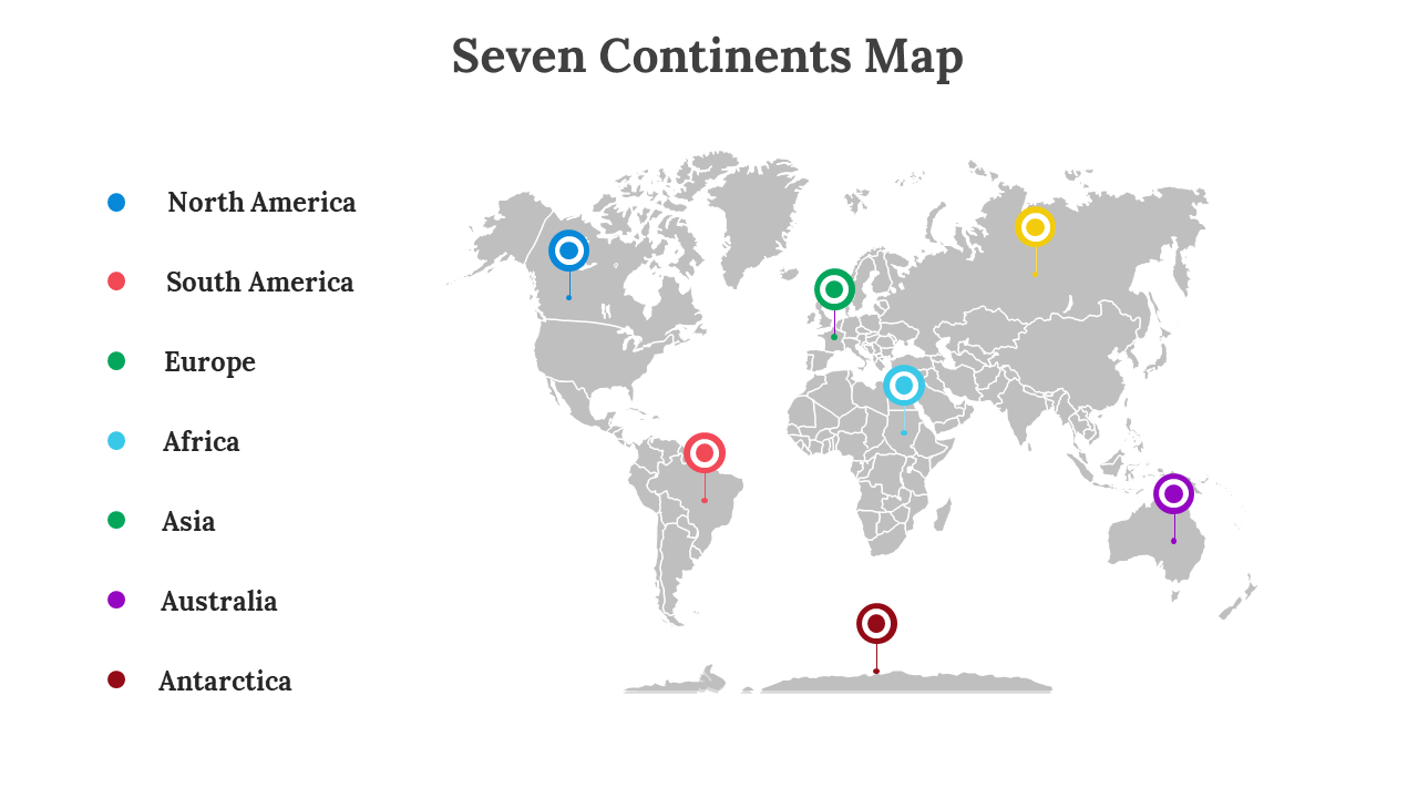 Embark on an exciting journey around the world with our Seven Continents Map PowerPoint Presentation. Explore the amazing features, landmarks, and diverse cultures of each continent. This interactive template is perfect for teachers, researchers, travel enthusiasts, and professionals who want to share information about the seven continents in a captivating way. The slides are easy to customize and include clickable regions and zoom-in options. You'll find ready-to-use world maps, icons, and graphics to create engaging presentations. Show your audience how our world is interconnected and inspire them to appreciate the beauty of global diversity. Make your presentations unforgettable with our Seven Continents Map PowerPoint Presentation.