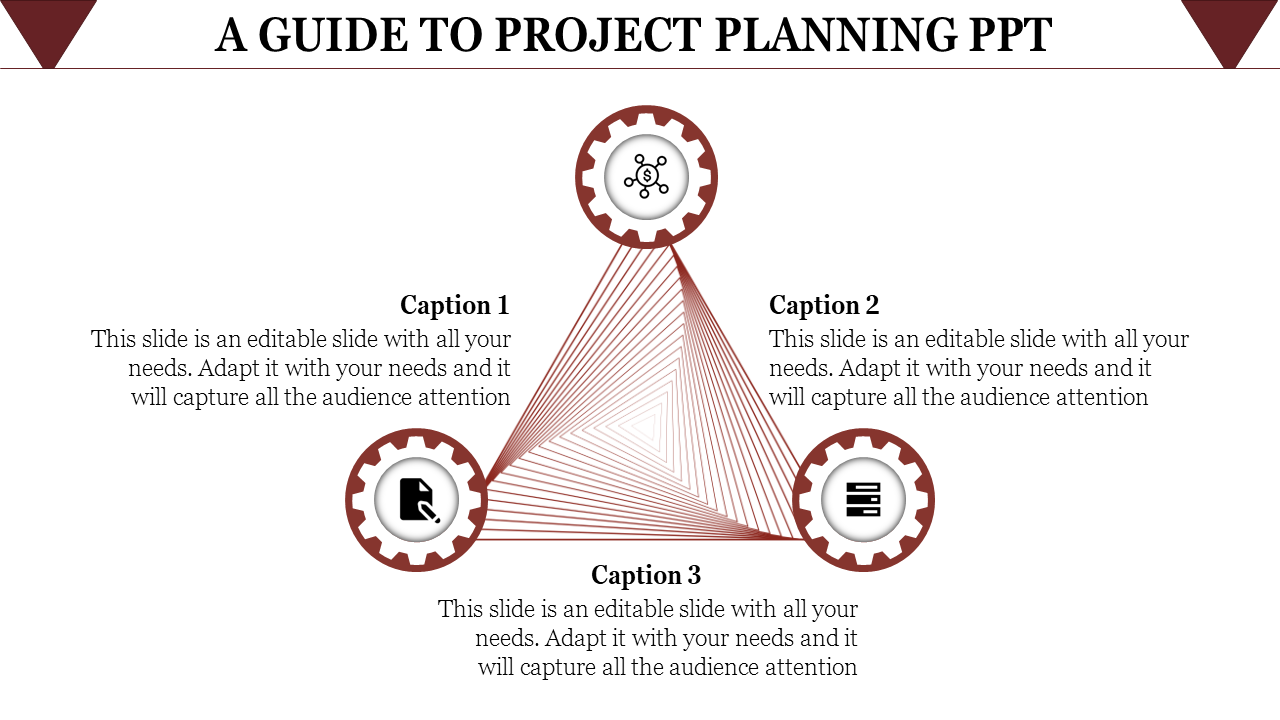 Make your project planning a breeze with our easy-to-use PowerPoint template. The slide has a triangle layout with captions in each corner, making it straightforward for anyone to understand. Perfect for both project managers and team members, it helps explain milestones, timelines, and tasks clearly.