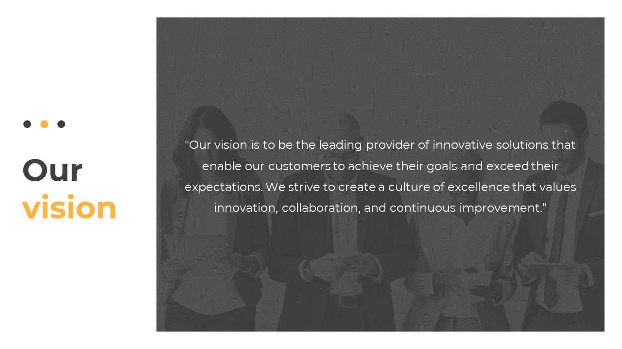 Research has shown that a person’s average attention span is just eight seconds, so it’s important to engage your audience’s attention in the shortest amount of time possible. An engaging about us page with dazzling visuals and succinct messaging can be the difference between a fortunate pitch and a missed opportunity. Give our pre-made slide a try to make such a powerful about us page for your presentations or website. With its elegance and professionalism, this slide will give you the opportunity to showcase your brand’s story, mission, values, vision, and achievements with clarity. Get cracking!