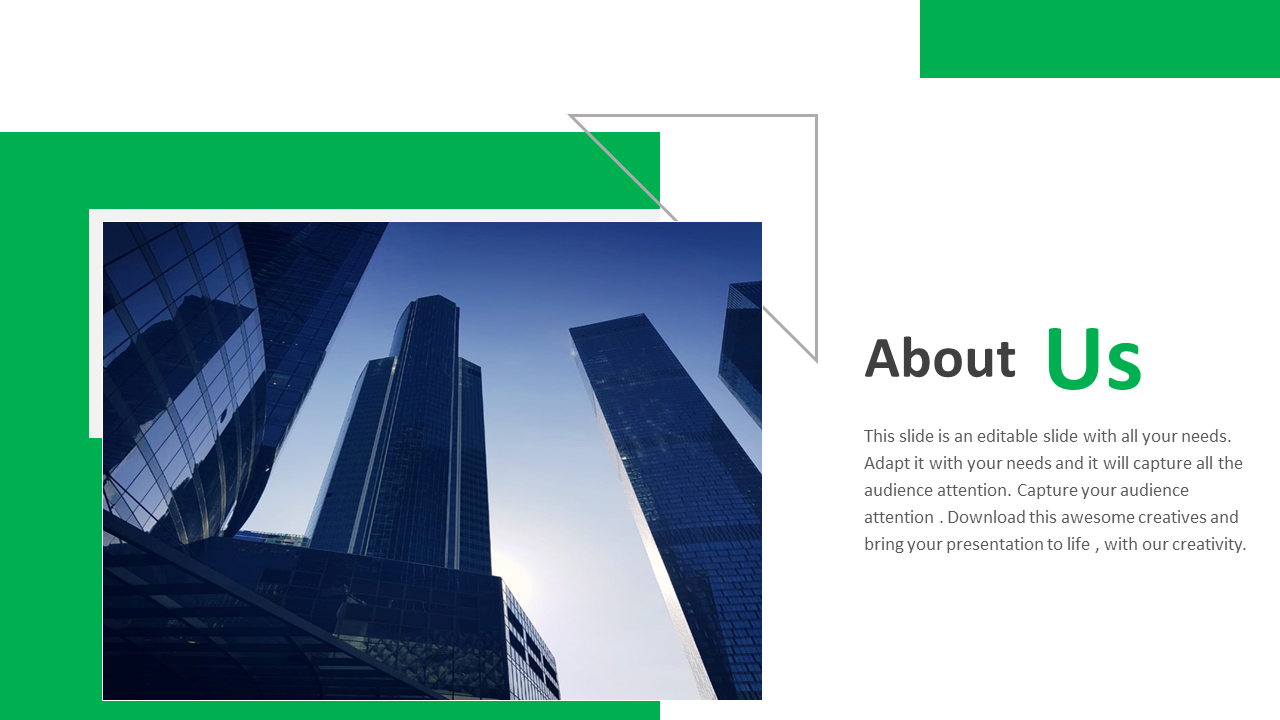 Get our About Us PowerPoint Template Free Slide to illustrate the company profile and idea to the audience. The About Us template will help you showcase your Business Profile idea, about us, models, etc. This template is mainly used in a business meeting or company meeting. It is a green template with a titleholder. The titleholder has captions to add users' information. Also, The designs of this About Us PowerPoint Template Free Slide help increase the audience's interest. In addition, Our users can select any about us PPT slides. It is a pre-built slide with all these essential elements to designing the best Company profile PPT. You can edit the image and text in this template. Our template is distinct and detailed. However, This template is 100% editable.