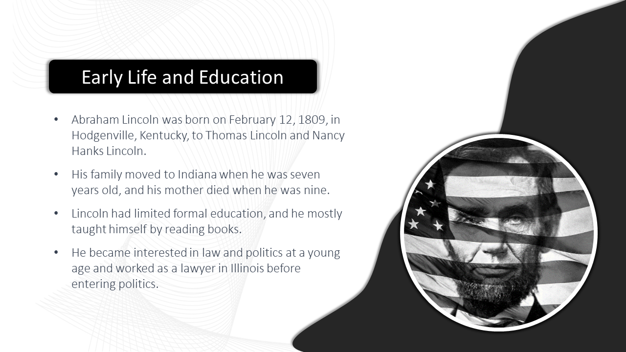 Abraham Lincoln was the 16th President of the United States, serving from 1861 until his assassination in 1865. He is widely regarded as one of America's greatest leaders, having guided the nation through the Civil War and played a key role in ending slavery. Born into poverty in Kentucky, Lincoln had a passion for education and self-improvement that eventually led him to the White House. His famous Emancipation Proclamation and Gettysburg Address are among the most iconic speeches in American history. Lincoln's legacy continues to inspire leaders around the world today. Use this template to learn from his leadership style.