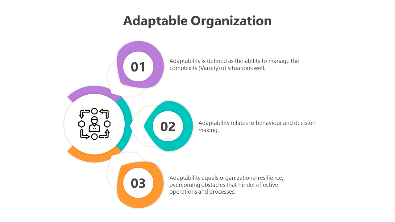 An adaptable organization is one that possesses the agility and flexibility to respond effectively to changes in its external environment. In today's dynamic business landscape, where markets, technology, and customer preferences evolve rapidly, adaptability is a crucial trait. Such organizations can quickly adjust their strategies, structures, and operations to thrive in the face of uncertainty. This concept highlights the need for businesses to embrace change, foster innovation, and remain resilient. Flexible Organization are not just reactive but proactive in identifying opportunities amid challenges, ultimately ensuring long-term sustainability. The adaptable organization templates is a powerful resource designed for professionals, leaders, and educators who seek to convey the principles of adaptability in the corporate world. This template offers a collection of fully editable slides specifically tailored to the concept of Agile Organization. It can be effectively used by change management consultants, corporate trainers, or business leaders to communicate the importance of adaptability, outline strategies for fostering it, and share best practices with their teams or audiences. Whether discussing the importance of adaptability in the face of market shifts or presenting case studies of organizations that have successfully adapted, this template provides a polished and visually appealing foundation for crafting impactful presentations. Users can easily customize each slide to align with their unique messaging, making it a versatile tool for instilling adaptability as a core value within organizations.