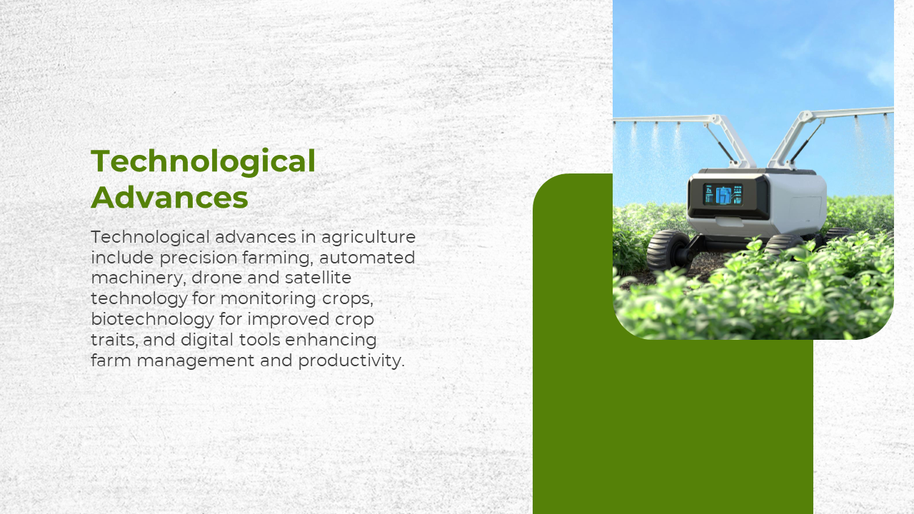 Our presentation on Agricultural Engineering is meticulously designed to offer an in-depth overview of this vital field. It includes a comprehensive exploration of modern agricultural technologies, innovative machinery, and sustainable practices.