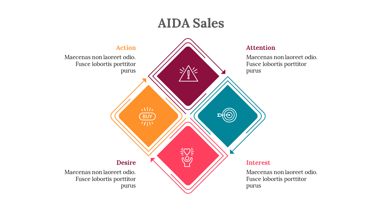 Are you looking for professional slides to help you close the deal? AIDA Sales Model is a form of marketing and sales strategy in which businesses focus on attracting, engaging, and converting customers. Try our template with 21+ slides! With its sleek, modern design and intuitive layout, this template will make your presentation stand out from the crowd. Also, take advantage of its well-thought-out structure to make sure that your audience is captivated throughout your pitch. With various designs, text areas, and icon packs, you'll have all the tools you need to help make your case. Also, make sure you have the edge in your next sales pitch with our template.