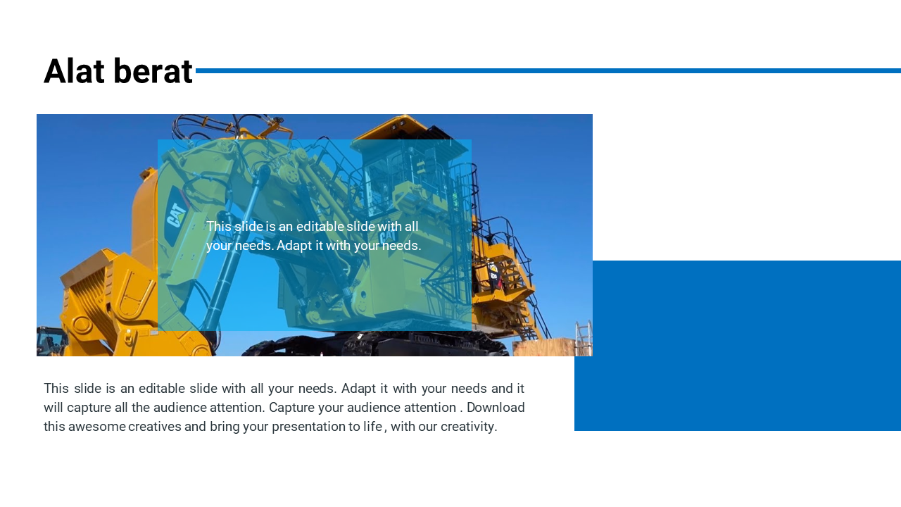 Construct construction-related presentations with this Alat Berat PowerPoint Download Design. This is a 100% user-friendly template. This is a professionally well-made template. This pre-designed template saves your time and eases your work in presentation-creating. This is an entirely user-friendly template.