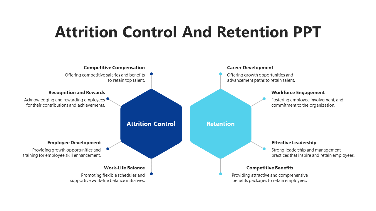 Discover the strategic pillars of Attrition Control and Retention, an indispensable concept for maintaining a steadfast workforce. In the dynamic landscape of modern business, understanding the drivers of employee turnover and implementing strategies to nurture loyalty is paramount. This concept delves into the intricacies of employee engagement, professional growth, and fostering a positive work environment to reduce attrition rates. By emphasizing these aspects, companies can cultivate lasting relationships with their employees, leading to enhanced productivity and a harmonious workplace culture. Let's delve into the foundational principles that underpin this vital organizational pursuit. For HR professionals, managers, and business leaders, our Attrition Control and Retention PowerPoint template serves as a comprehensive guide. Tailored to communicate the nuances of this concept, the slides offer succinct explanations and visually engaging graphics. Every slide is fully editable, granting you the flexibility to align the content with your organization's specifics. As you navigate through the template, you not only equip yourself with valuable insights but also inspire your audience to adopt these practices for a more cohesive and prosperous work environment.