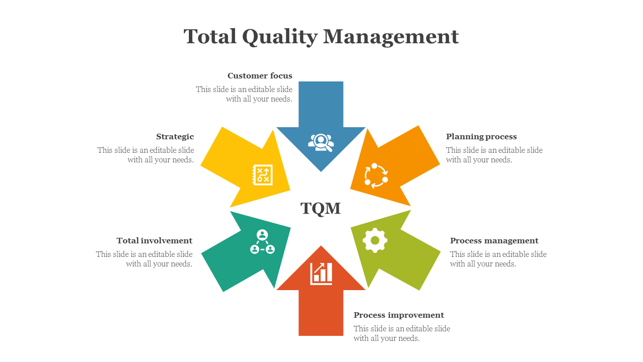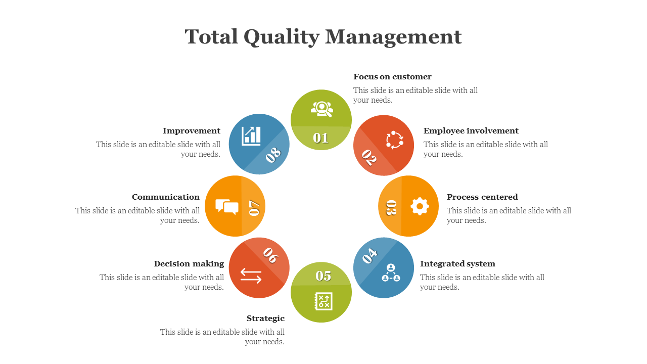 Quality is not a one-time achievement, it's a journey. Join the quest for excellence with Total Quality Management and see your organization thrive like never before! TQM is a management approach that prioritizes continuous improvement and excellence in all aspects of an organization. It focuses on meeting customer expectations and delivering high-quality products and services by involving all employees in the quality management process. Using our creative presentation deck, you can showcase the success of your TQM and its benefits to your stakeholders.