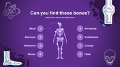This biology-themed slide is designed to introduce Pre-K students to bones in a way that is both fun and educational. Featuring kid-friendly visuals, simple text, and engaging facts, this slide helps young learners understand why bones are important, how they assist in movement, and ways to keep them strong.
