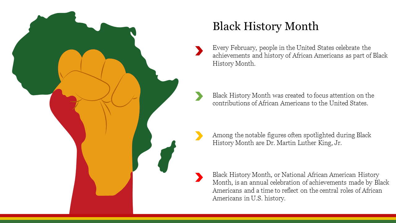 Want to praise Black History achievements to inspire positivity and the right to life and liberty? Get our Black History Themed PowerPoint Slides. This theme Template has four text areas with a raising hand on the Africa map to show Black History. You can highlight the Black History thought and expression in these text areas to make your presentation well-informed. In addition, you can showcase the Black History view in a Special day meeting or public meeting. Finally, you can list Black History opinions in this Black History Themed PowerPoint Slides for a better experience. Also, You can edit the text area by adding your data. Our users can choose any slide from the Remarkable day PPT Templates. Also, Users can use this slide to explain their Human Rights idea very well. It also allows you to describe the core content of your idea.