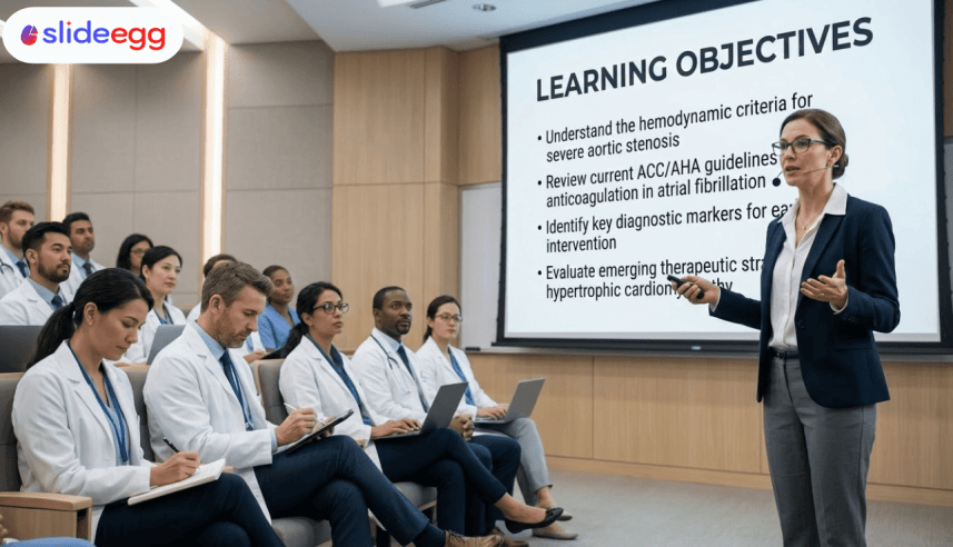 Tell your audience exactly what they will learn. Use three to five clear learning objectives. This sets expectations and helps your audience focus on what matters. For example, understand the hemodynamic criteria for severe aortic stenosis, or review current ACC/AHA guidelines for anticoagulation in atrial fibrillation.