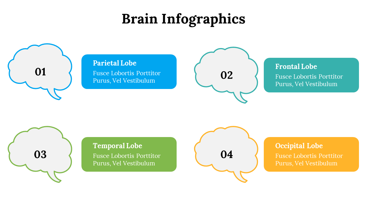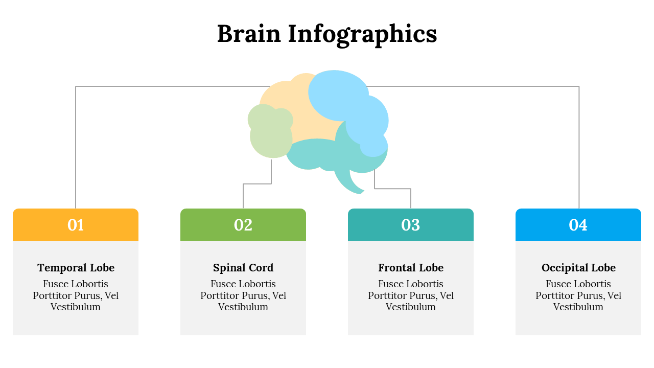 PowerPoint template displaying four colorful brain regions with labels for Frontal, Temporal, Parietal, and Occipital areas.