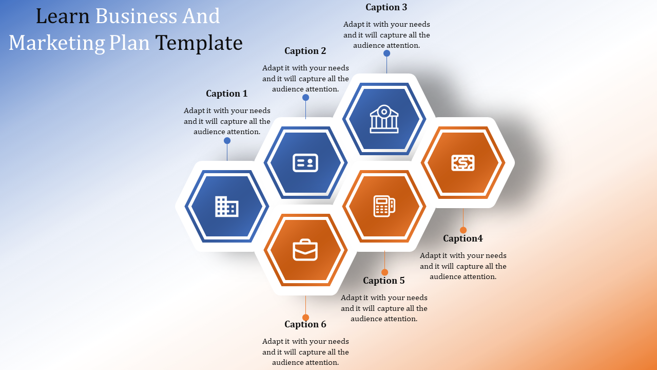 Our business and marketing plan PPT template is designed to help entrepreneurs, professionals, and students create a clear roadmap for their ventures. It's easy to use and looks great, with hexagonal shapes that show how different parts of your business connect. You can use these shapes to map out your company's strengths, weaknesses, opportunities, and threats.