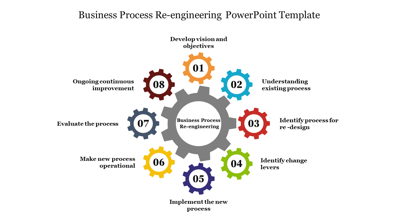 This re-engineering PowerPoint template is designed well in a gear model. Here there are eight nodes plus one central gear. The gears are colored with multiple colors to show differences and agree many facilities are available. You can customize your template and make them available for future presentations.