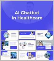 AI chatbot in healthcare slides on various applications with different layout designs and text descriptions.