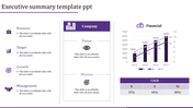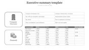 Executive summary slide showcasing business analysis, financial data, and company vision and mission in a structured layout.