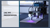 CNC machine operating on a piece of material with a purple laser, in a blue background and text on the left.