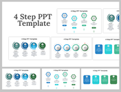 Collection of slides featuring 4 step processes, with circular and hexagonal icons in blue, and green tones.