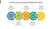 Five circular arrows in blue, green, orange, teal, and yellow, each with icons inside, aligned in a horizontal sequence.