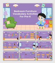 Bedroom furniture vocabulary activities presentation for Pre-K with colorful illustrations, playful design and editable text.