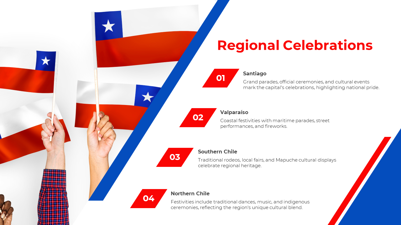 Embracing Heritage and Independence Chile National Day commemorates the country's declaration of independence from Spain on September 18, 1810. It is celebrated by Chileans nationwide, including government officials, cultural figures, and citizens of all backgrounds. The day is marked with patriotic ceremonies, traditional dances such as the Cueca, delicious food, and vibrant street festivals known as "Fiestas Patrias." Participants include people of all ages, from children to seniors, who come together to honor their history, culture, and collective identity as Chileans.