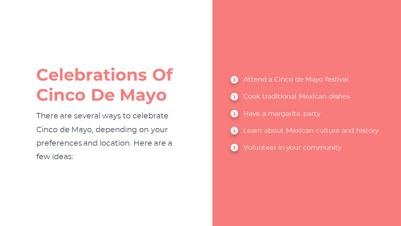 Cinco de Mayo is a festive holiday celebrated on May 5th, primarily in Mexico and the United States. This day is celebrated with parades, music, traditional dances, and vibrant cultural events. Our Cinco de Mayo slide deck, includes historical background, key facts about the battle, and cultural significance, and showcases the colorful traditions and customs associated with the holiday. Our slide incorporated lively visuals and interactive elements to engage the audience. With this pre-designed deck you can convey the festive spirit of Cinco de Mayo.
