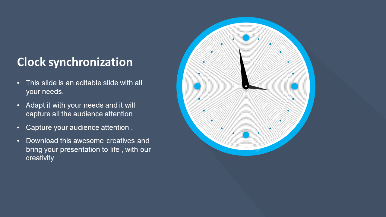 clock synchronization ppt template is an exclusive template that gives a fantastic impression on your presentation. The template is a clock designed with a text area on the left side of the template.