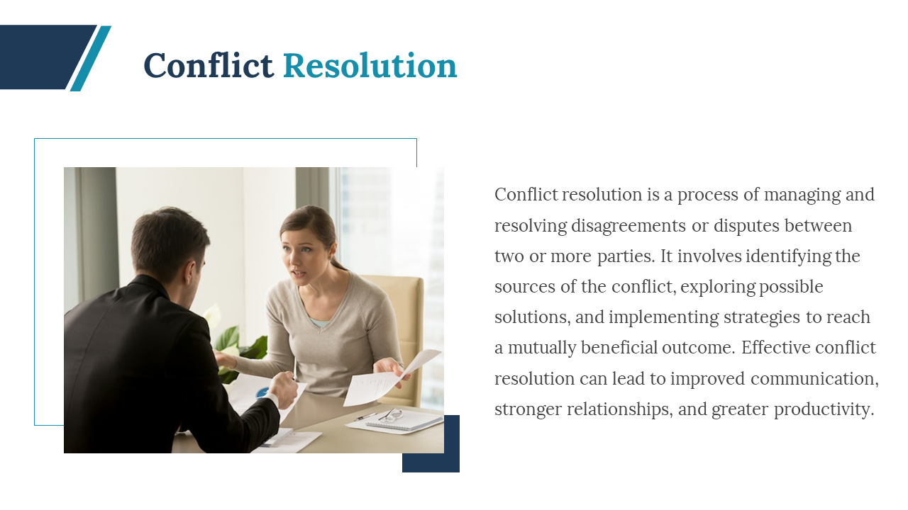 Conflict is a disagreement or clashes between two or more parties, often arising from differences in opinions, interests, or values. It can occur in various contexts, such as personal relationships, workplaces, communities, and countries. This template is designed to help presenters explain different types of conflicts, their sources, and potential ways of resolving them. It is a useful tool for anyone looking to discuss conflict and conflict resolution professionally and effectively.
