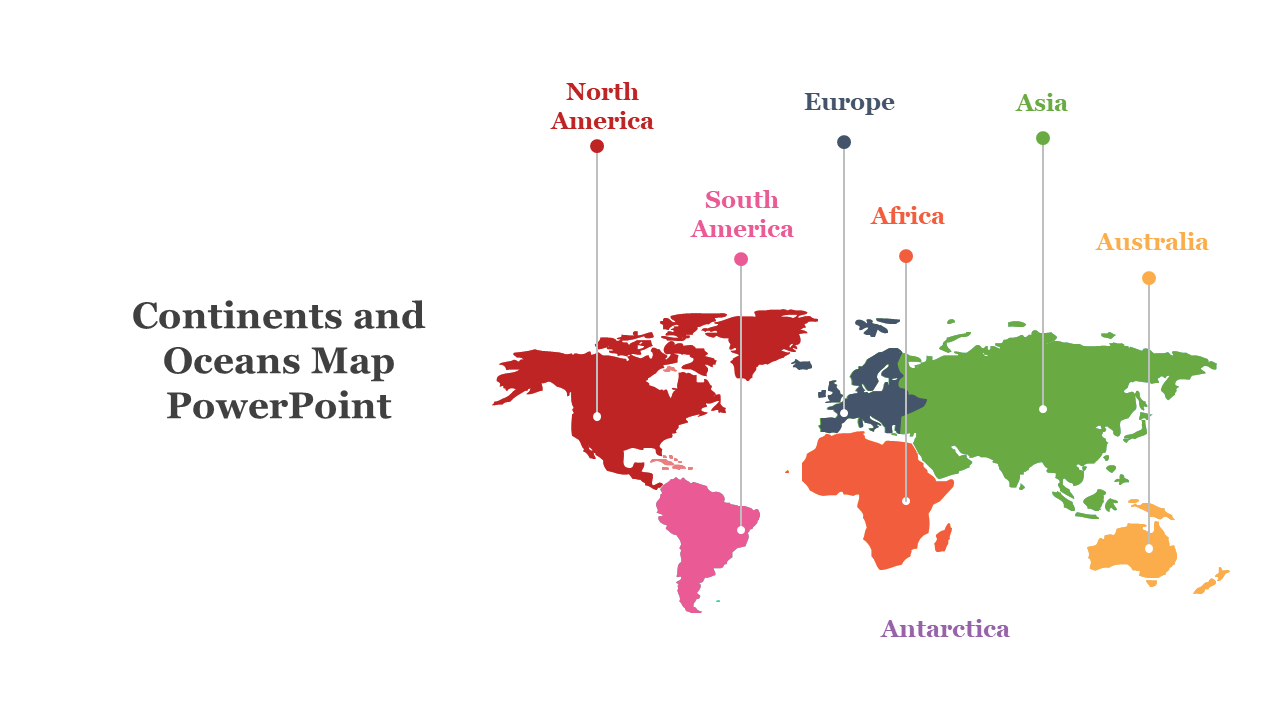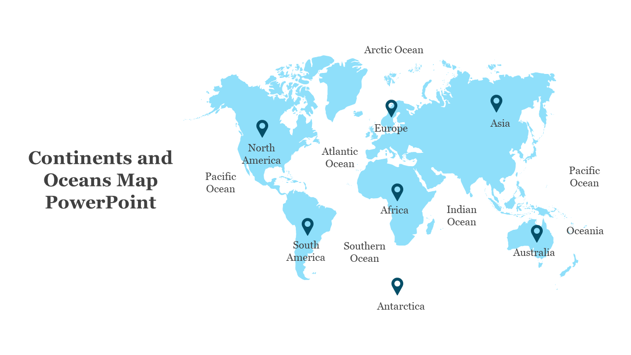 The continents and oceans map shows the world's land masses and bodies of water. It is an excellent tool for creating informative and engaging presentations related to global geography, travel, education, or business. The template includes 13 customizable slides, including a world map, continents, and ocean-specific slides. Download our continents and oceans world map PPT template today and take your audience on a journey around the world with just a click of a button!