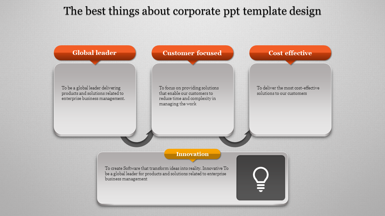 Make alterations to your corporate presentations with our sophisticated Corporate PPT Template Design. The slide has a sleek layout featuring three square and one rectangular text box. It allows for seamless customization with descriptions. The rectangular tab is given with a business idea icon. It symbolizes innovation and creativity. Apt for corporate executives, managers, consultants and analysts.
