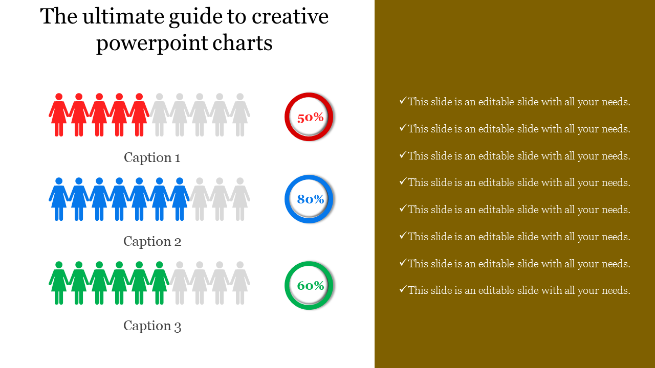 Guide your target audience by demographic indicators with our Creative PowerPoint Chart Template. The slide has three sets of human shadows in different colors. Percentage values are given beside the images. Captions provided below the shadow images can be customized. Separate space for description gives the audience an intention to pick the template.