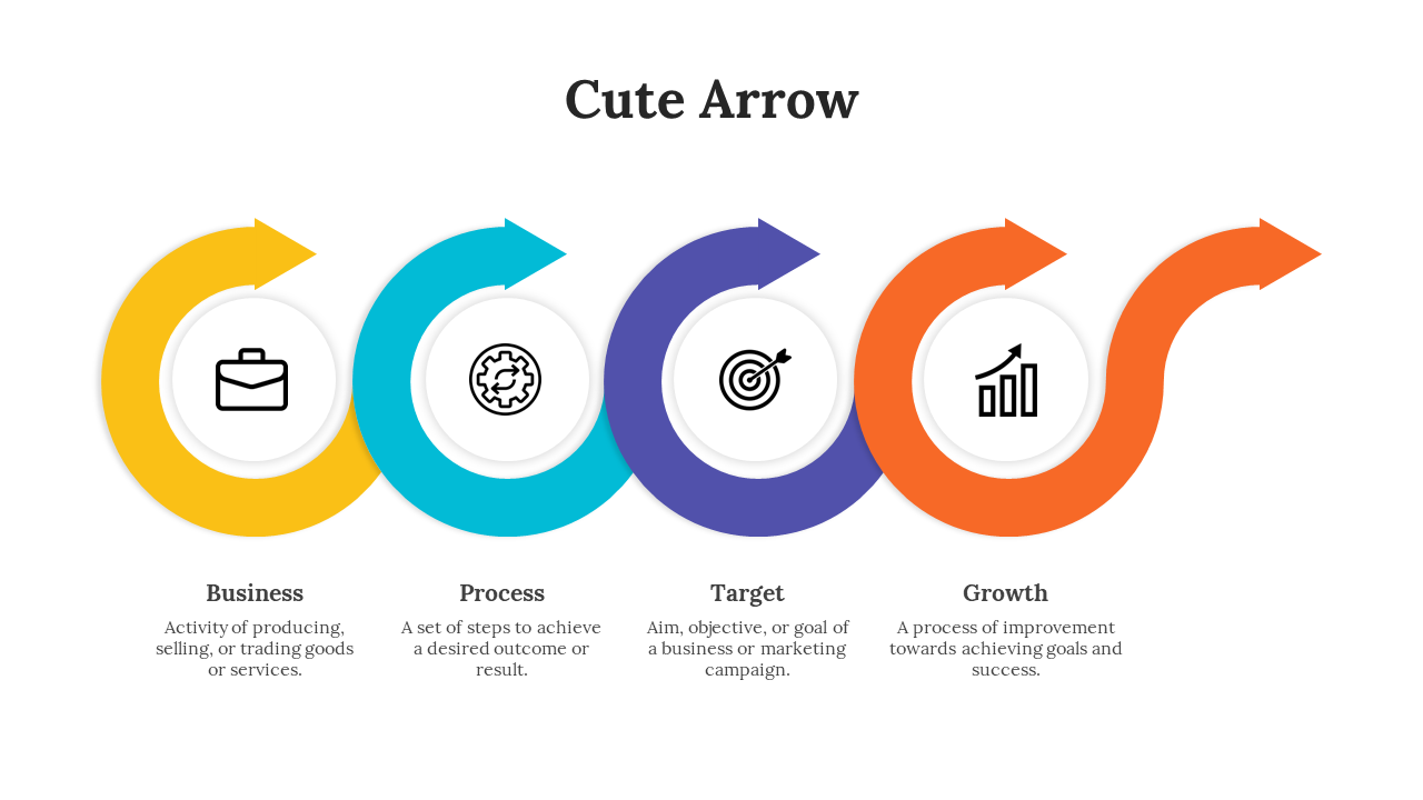 The Arrow for Business template symbolizes progress and advancement in the context of process, target, and growth. It represents the direction and movement towards achieving business objectives. The arrow points towards success, signifying the continuous improvement and forward momentum needed to reach targets and drive growth. This template serves as a visual reminder to stay focused, determined, and proactive in pursuing business goals., you can use this template. If you want to explain more about Cute Arrow. you can use this template.