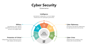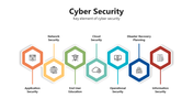 Cyber security slide with a colorful lock in the center, surrounded by six circular icons in different colors with captions.
