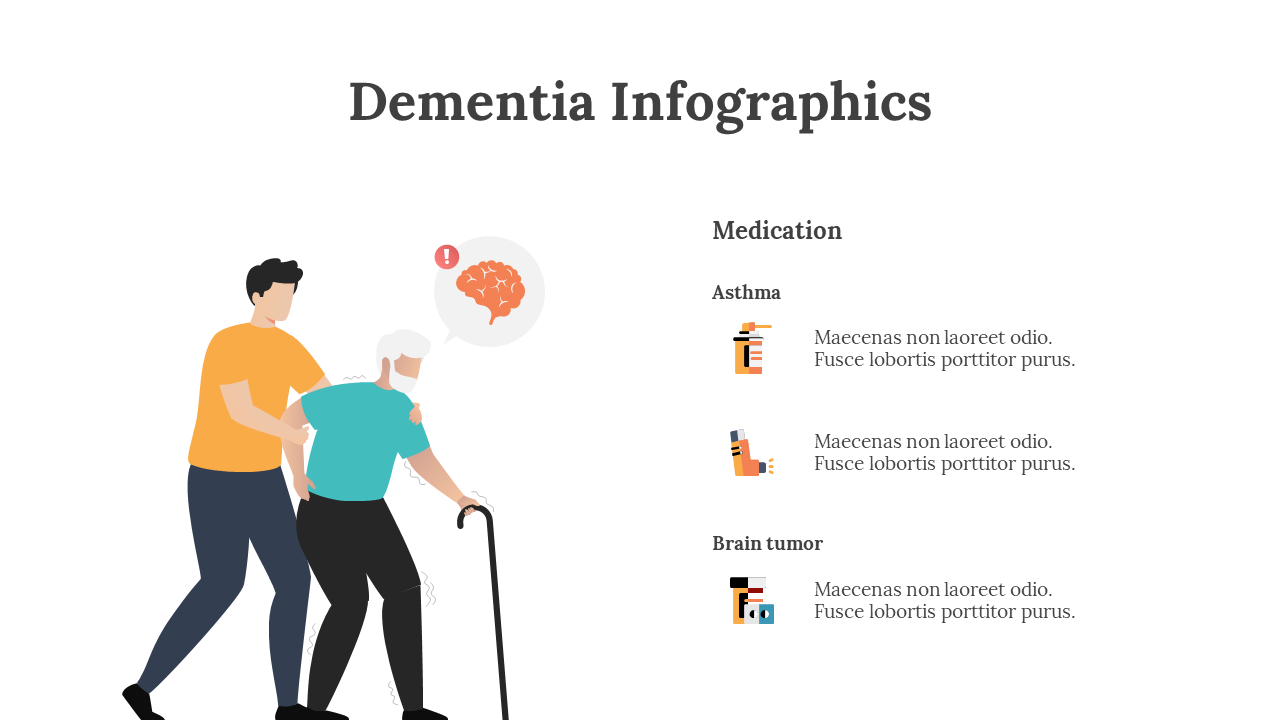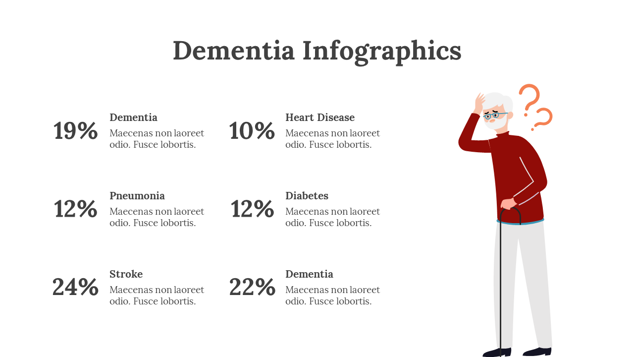 Alzheimer's disease, one of the causes of dementia is a word used to designate a set of symptoms that severely affect thinking and memory. It's not a specific disease; it's just a consequence of other factors, such as aging. And here is your best bundle of slides, that just suits your topic. Just use it for all your medical PPTs and others!