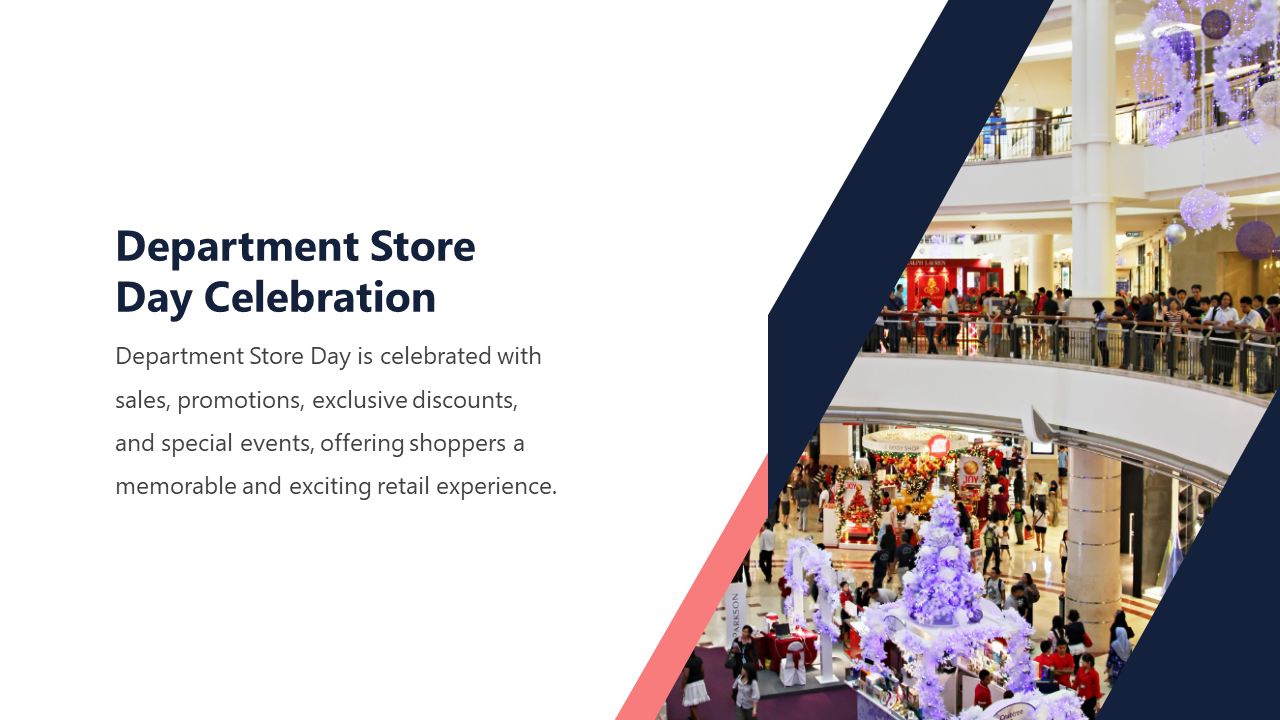 Celebrate the essence of retail therapy on Department Store Day, an occasion that honors the central role of department stores in our shopping experiences. Join us in recognizing their value, from offering diverse products under one roof to creating memorable shopping journeys. The Department Store Day PowerPoint template is a valuable asset for marketers, retail professionals, and event organizers, enabling the effective commemoration of this special day. With fully editable slides, this versatile template simplifies the message about department stores' importance, whether for special events, marketing materials, or presentations. It empowers you to share insights into their history and cultural significance while inspiring others to join in the celebration. Capture the legacy of department stores with this template, elevate your presentations, and encourage your audience to partake in the Department Store Day festivities, fostering a deeper connection and appreciation for these retail institutions.