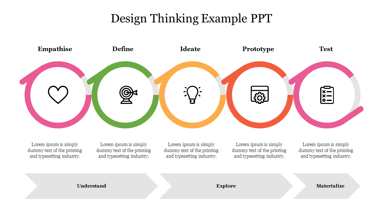 How about trying this Design Thinking Example PPT Template for your descriptive presentation. The template is used for marketing purposes. The template is added with five highly efficient nodes. The template is added with a linear flow design that shows the use of the presentation. Make use of this template for conferences and presentations.