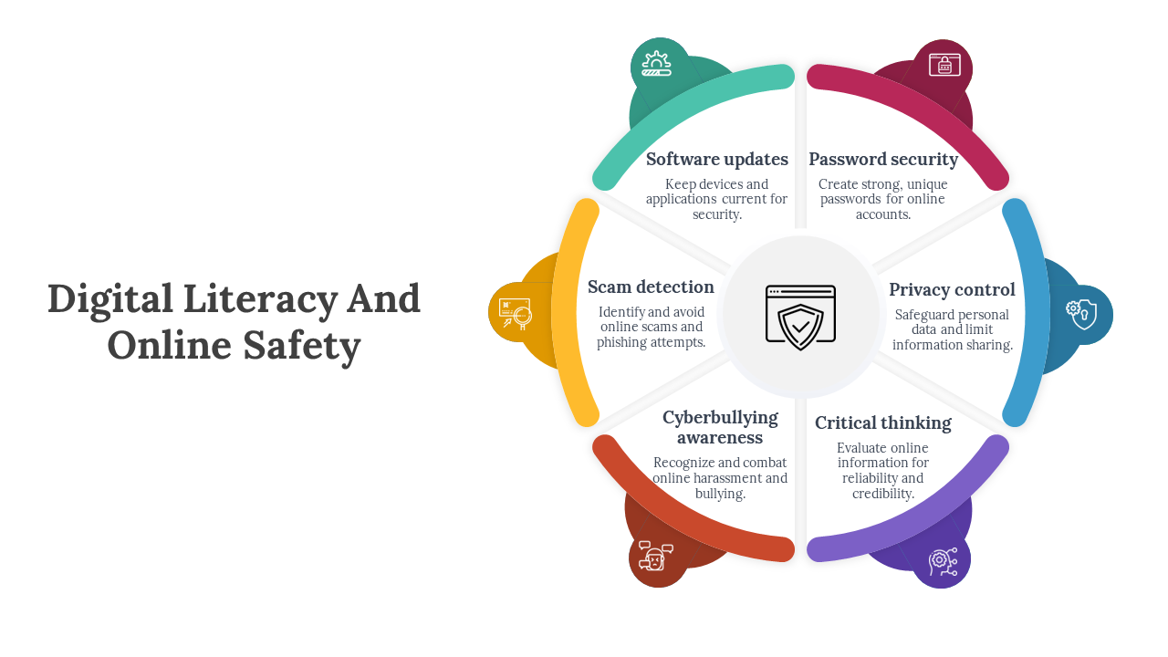 Explore digital literacy and online safety with our engaging education presentation. In the digital age, understanding the concept of digital literacy and implementing online safety measures is paramount. Our professionally crafted template simplifies complex topics, offering practical safety tips and guidance. This unique resource ensures that educators, parents, and professionals can effectively communicate the importance of digital literacy and online safety. All slides are fully editable, allowing presenters to customize the content to suit their needs. Equip your audience with the knowledge and skills to navigate the digital landscape securely, making this education presentation a valuable tool for promoting responsible digital citizenship.