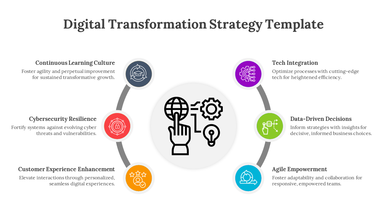 Embarking on a Digital Transformation Strategy propels organizations into a future where technology seamlessly integrates with data-driven decisions, agile empowerment, enhanced customer experiences, cybersecurity resilience, and a culture of continuous learning. More than a technological shift, it's a holistic mindset that fosters innovation and adaptability. This strategy positions businesses not only to survive but to thrive amid evolving customer expectations, technological advancements, and dynamic market landscapes. Presenting a dynamic multicolor-themed PowerPoint with six nodes, tailor-made for tech leaders and professionals spearheading Digital Transformation. Beyond its aesthetic appeal, this fully editable template becomes a dynamic platform, enabling precise communication of intricate strategies and milestones, empowering presenters to captivate audiences, and inspiring active engagement in the transformative journey towards digital excellence.