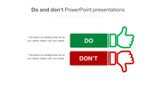 The Do And Don't PowerPoint Template Free Slide has a simple layout with two nodes. It has two callout model designs with clipart related to dos and don't. The green and red colors used in this template on a white background will maximize the readability of your presentation. Your viewers can easily and quickly understand the dos and don'ts and perform according to the rules.