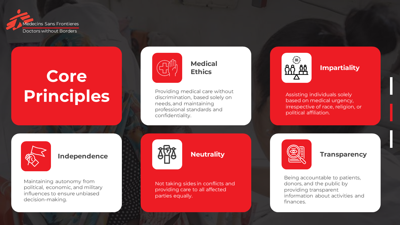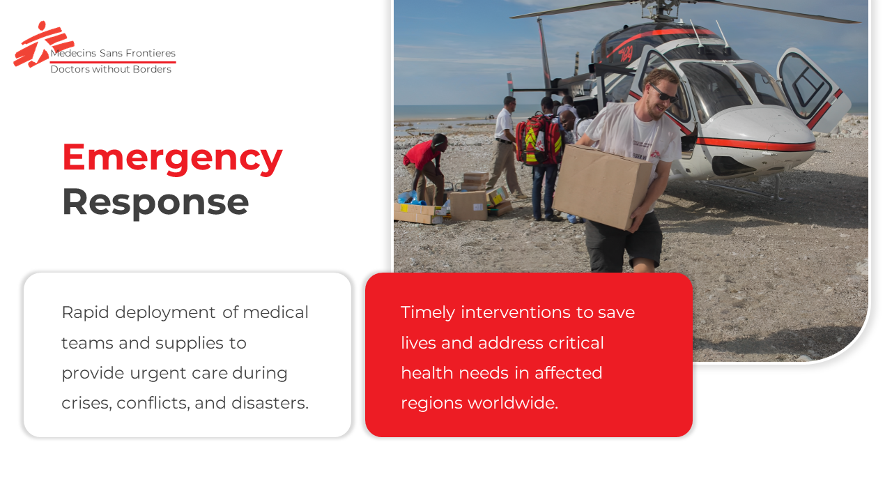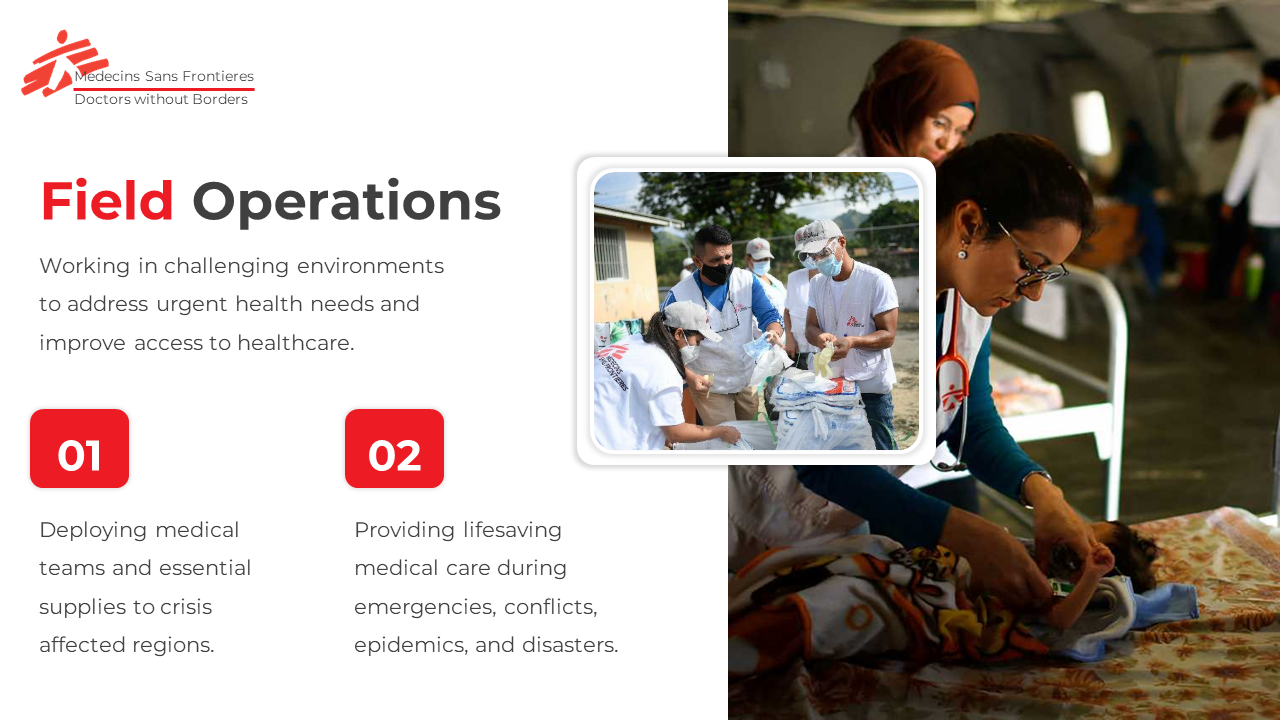 Doctors Without Borders, also known as Médecins Sans Frontières (MSF), is a renowned international humanitarian organization that provides medical aid and assistance to people in need, regardless of their race, religion, or political affiliation. Founded in 1971, MSF operates in areas affected by conflict, epidemics, natural disasters, and other emergencies. The organization's dedicated teams of medical professionals and support staff work tirelessly to deliver essential healthcare services, conduct life-saving surgeries, and provide critical supplies to vulnerable populations. MSF's primary mission is to alleviate human suffering and preserve human dignity by responding swiftly to emergencies and advocating for improved healthcare access and policies worldwide. By operating independently and impartially, Doctors Without Borders remains committed to providing medical aid where it is needed most, often in regions with limited access to healthcare resources. This template is ideal for educators, medical professionals, researchers, and anyone who wishes to raise awareness about the humanitarian efforts of Doctors Without Borders and its impact on global healthcare. offers a visually appealing and informative overview of Doctors Without Borders' history, mission, achievements, and ongoing projects. With fully editable slides, users can customize the content to suit their specific presentation needs, adding data, images, and case studies to strengthen the narrative. It empowers presenters to raise awareness about global health issues, advocate for medical aid in crisis zones, and inspire support and donations for the organization's life-saving work. the Doctors Without Borders template is a valuable tool that helps shed light on the organization's noble efforts in providing medical aid to those in need.