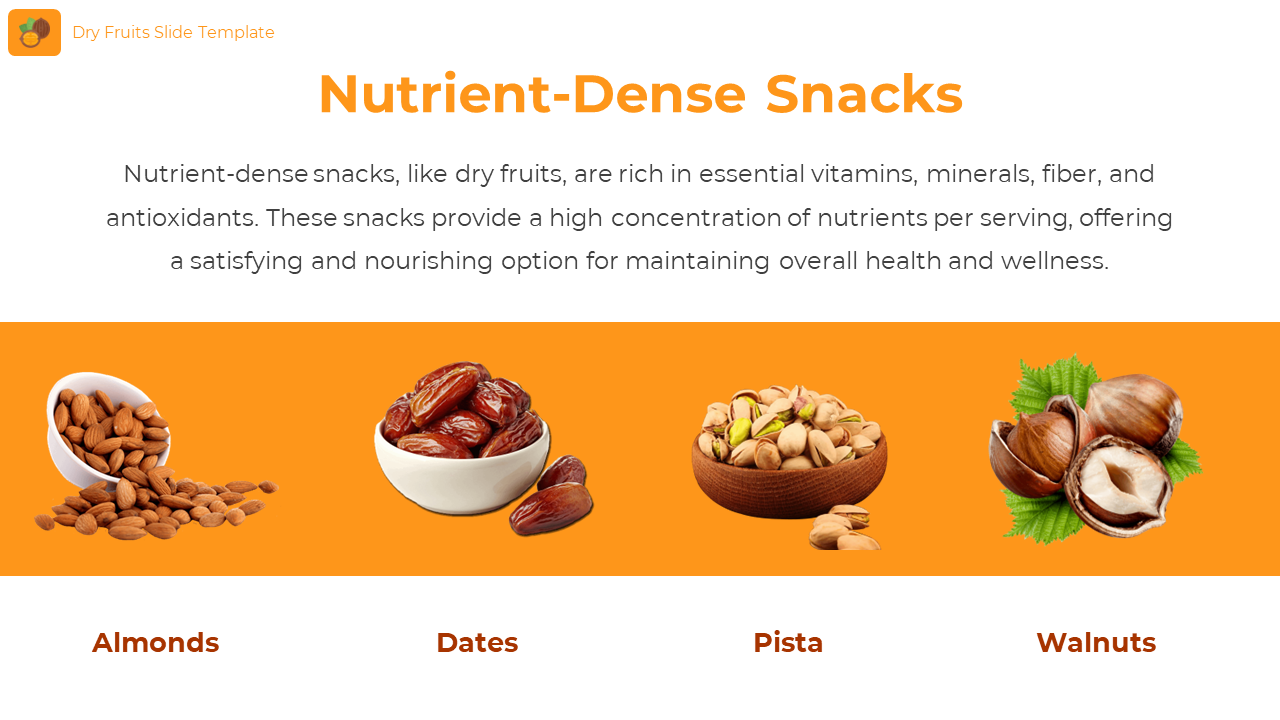 Dry fruits are fruits that have been dried naturally or through dehydration techniques, resulting in a concentrated form of nutrients. Dry fruits are packed with essential vitamins, minerals, and antioxidants that offer numerous health benefits. They are a convenient and nutritious snack option, providing energy, fiber, and a variety of nutrients. Our Dry Fruits presentation template offers a visually engaging platform to explore the world of dried fruits, their nutritional value, and culinary uses. With customizable slides and captivating visuals, it helps presenters educate and inspire their audience about the benefits and versatility of these healthy snacks.