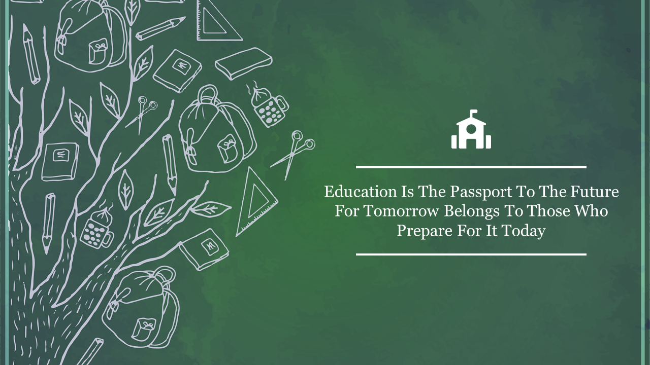 The Editable Back To School Template has a unique green background. It has a tree design, and the branches are filled with school stationery items, like pencils, bags, notebooks, etc. It also has a quote on education with white typography. It includes lots of school theme icons to enhance your presentation. Find more educational PowerPoint templates at SlideEgg with unique designs and colors.