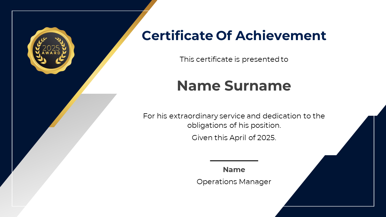 Recognize excellence and inspire greatness with professional certificates of achievement! The purpose of these certificates is to honor individuals who have demonstrated exceptional knowledge, skills, and dedication in a particular field or endeavor. Whether it’s in sports, education, or the workplace, these certificates will serve as a tangible symbol of recognition for the accomplishments and hard work of the recipient. It will boost their confidence and motivate the winners to continue striving for excellence in the future. It’s time to celebrate success and inspire greatness with our amazing slides today! Hurry to grab it!