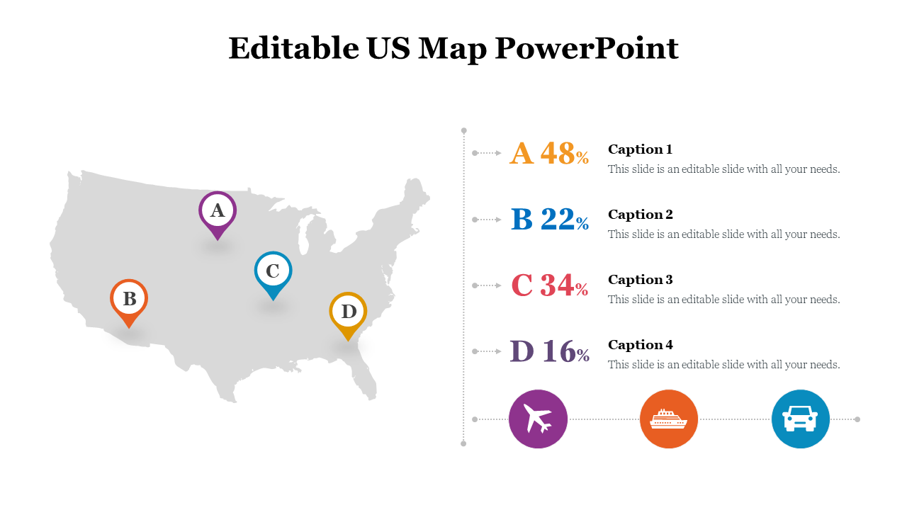 A US map is a useful tool for showcasing a variety of information, such as regional demographics, sales territories, or election results. It can also be used to illustrate geographic data such as population density or climate zones. A good US map slide should be clear, easy to read, and include state boundaries, names, and possibly major cities. Consider using different colors or shading to highlight certain areas of interest. A well-designed template can save time and ensure consistency across multiple slides or presentations.