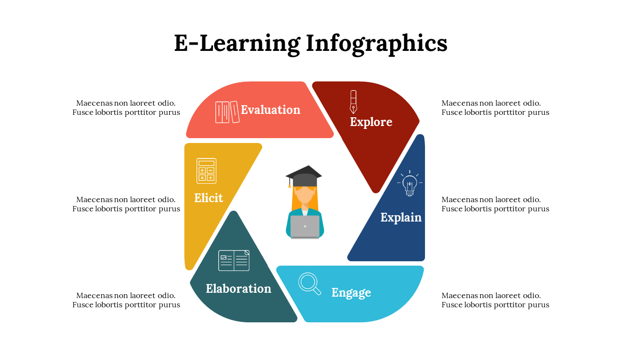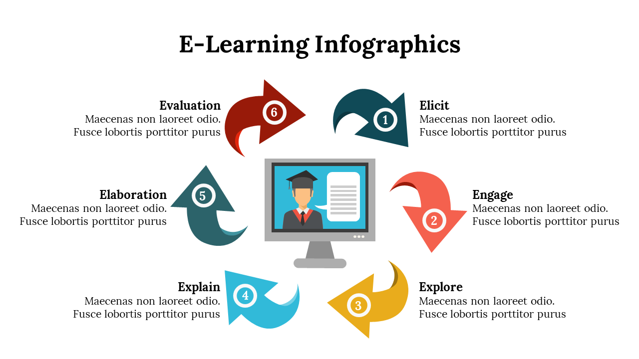 E-learning infographics are a type of visual aid that presents information related to online learning in a visually appealing and easy-to-understand format. These infographics can cover a range of topics, from tips for online study to the benefits of e-learning. They are often used by educators, instructional designers, and e-learning providers to explain complex concepts and engage learners. With their eye-catching design and concise messaging, e-learning infographics can be a powerful tool for communicating information and promoting engagement in online learning. This template can be used to create professional-looking e-learning infographics that can be easily shared with students, educators, and other stakeholders.